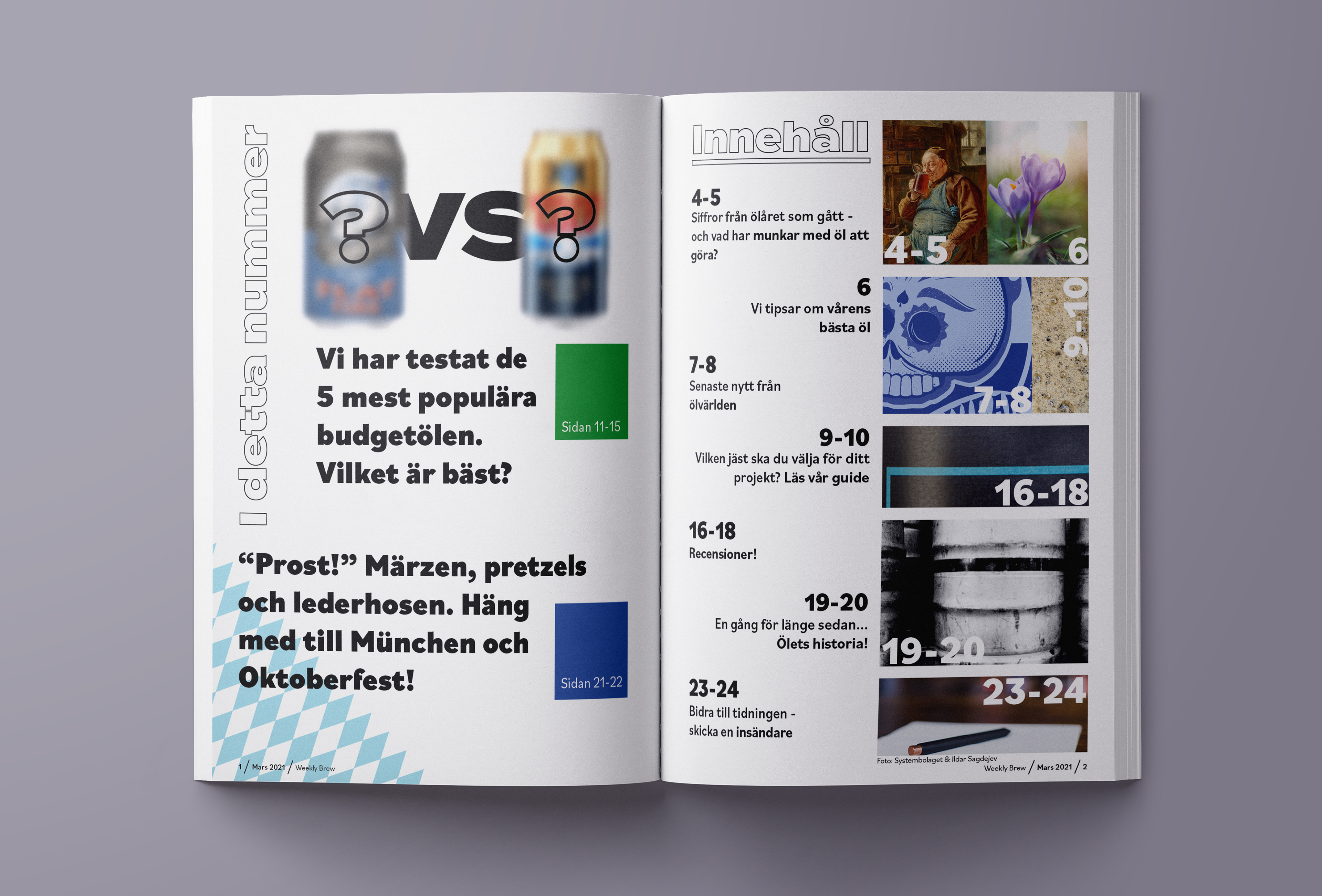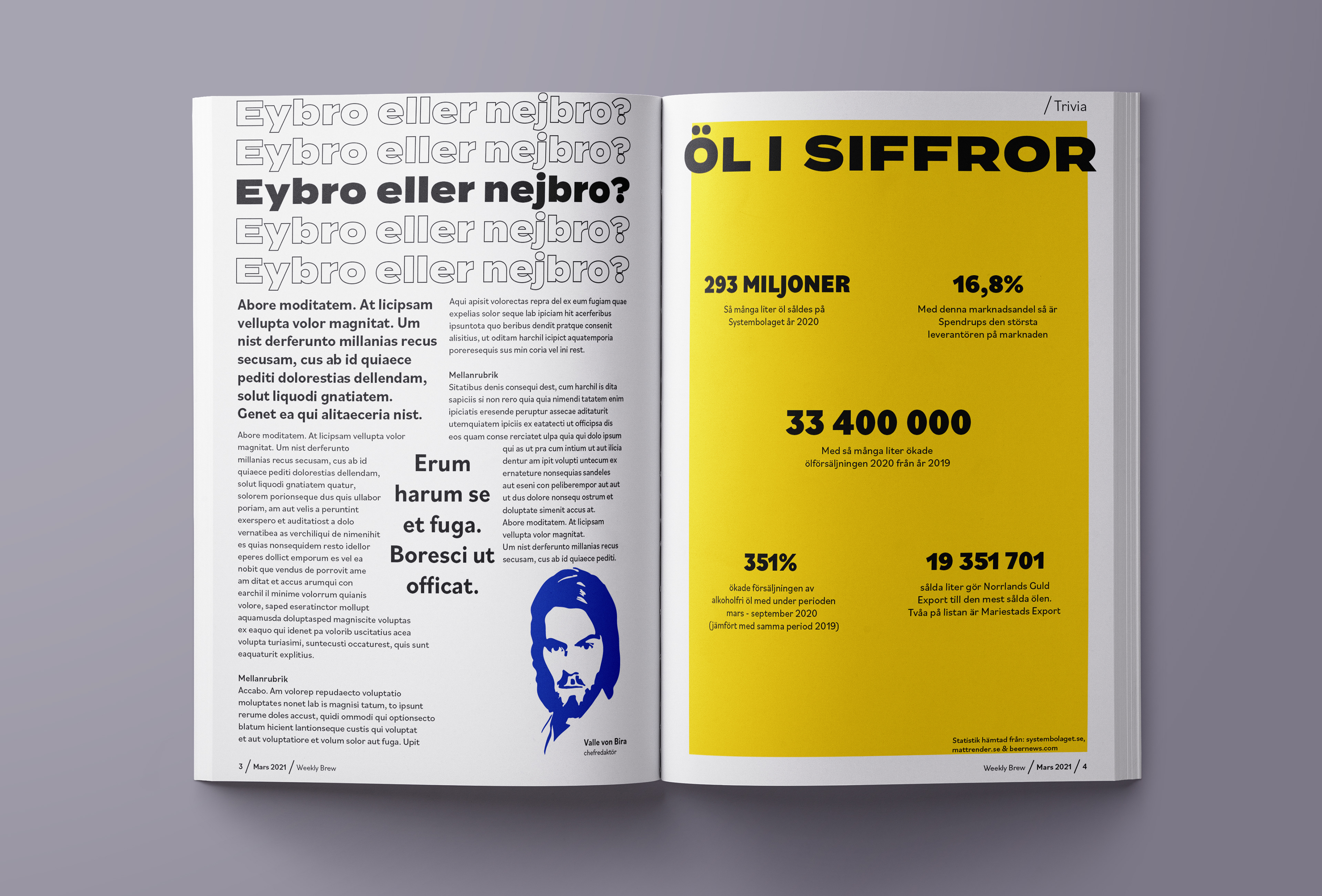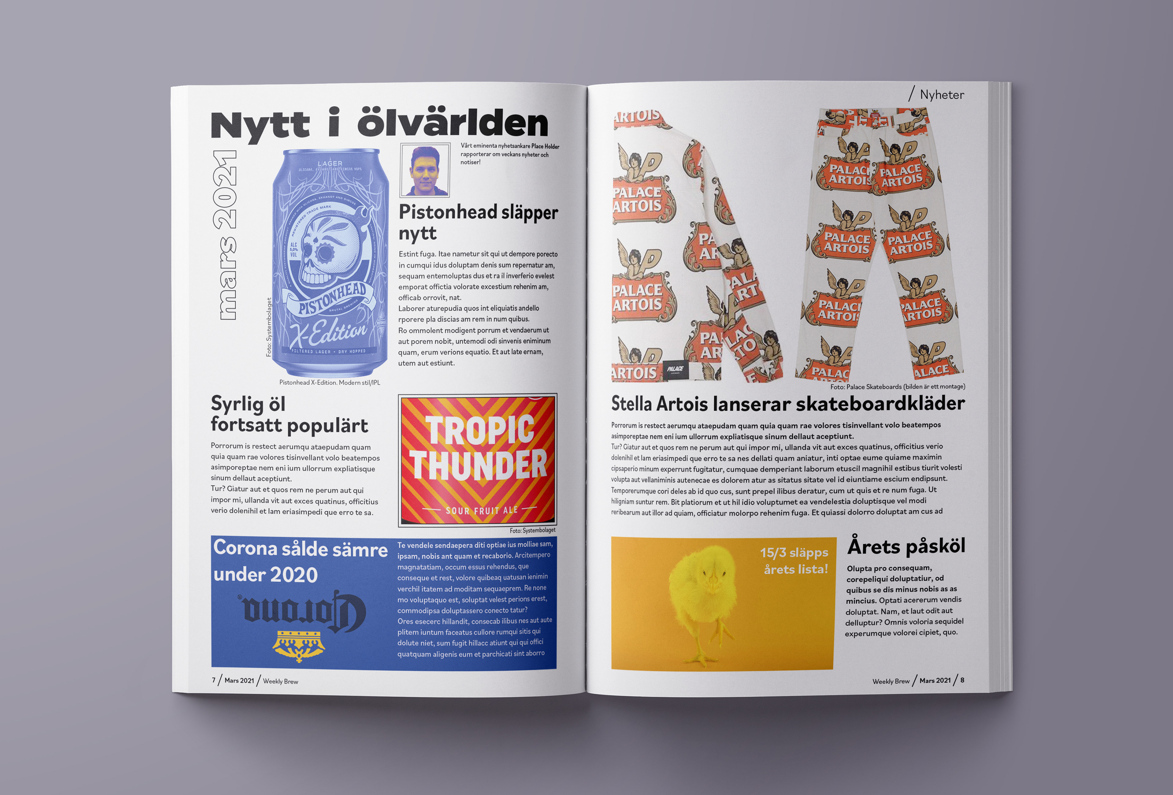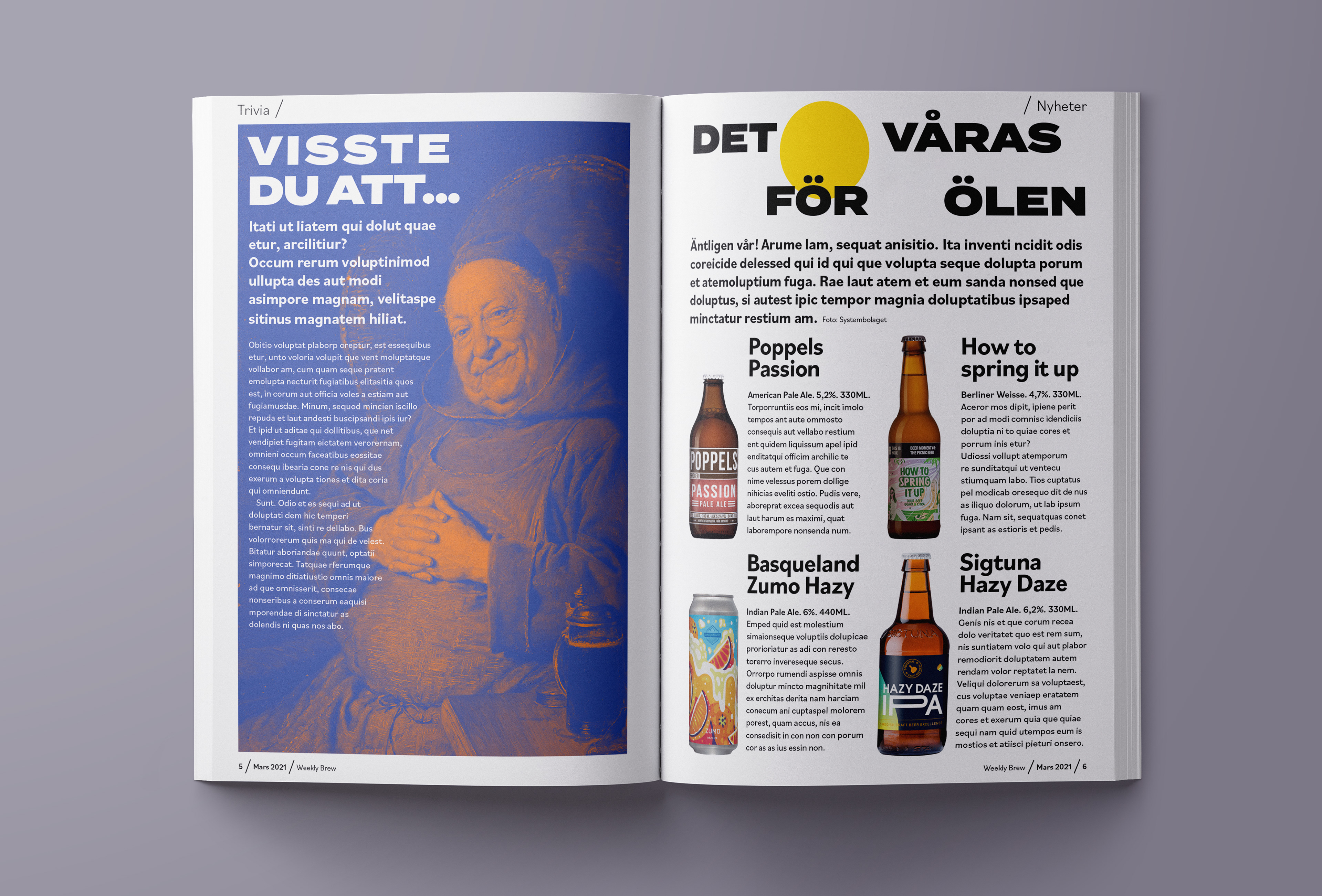 Redaktionellt layoutarbete för det fiktiva magasinet Weekly Brew, ett veckomagasin med puls på ölvärlden. Fokuset ligger på ett modernt formspråk för att särskilja sig från konkurrenterna.